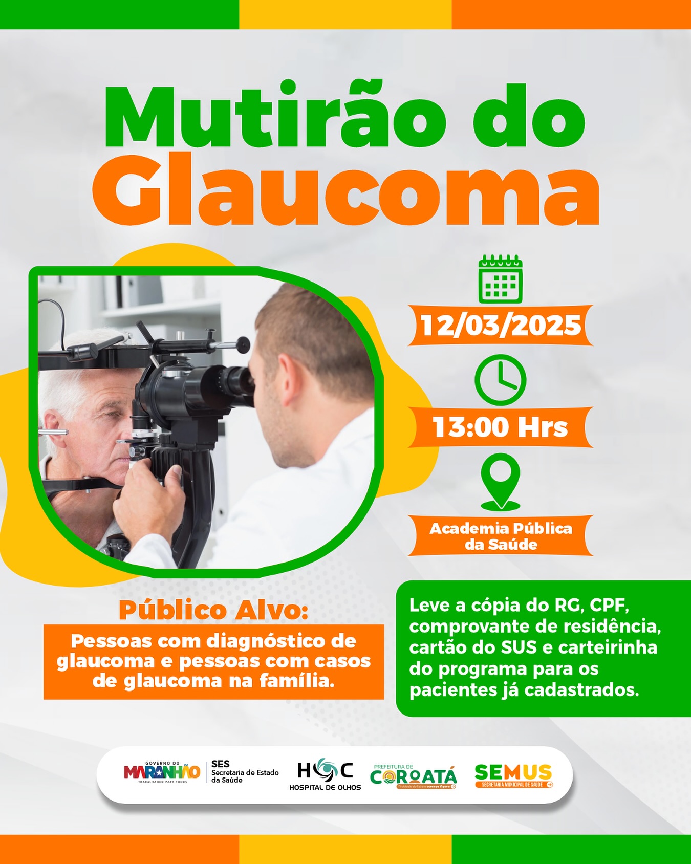 Pacientes com glaucoma terão a oportunidade de receber atendimento especializado durante o Mutirão do Glaucoma, que será realizado na próxima quarta-feira, dia 12 de março, às 13h, na Academia Pública da Saúde, em Coroatá.